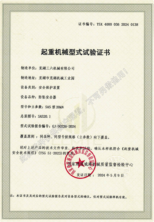 • SAS型20kN防墜器型式試驗證書