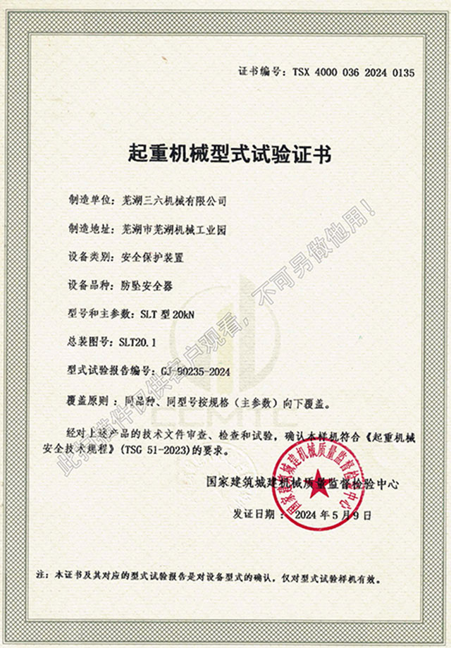 • SLT型20kN防墜器型式試驗證書